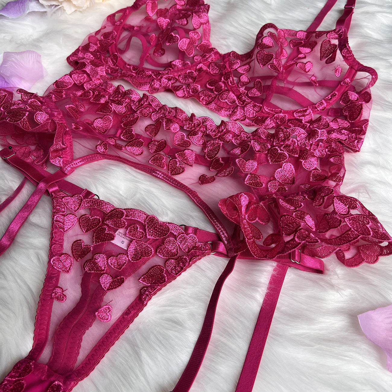 Cet ensemble fuchsia éclatant est un véritable coup de cœur, combinant à la fois romance et passion. Le soutien-gorge et la culotte sont ornés de délicats cœurs brodés, tandis que la ceinture jarretelle à volants accentue la taille de manière séduisante. C'est le mélange parfait d'élégance et d'audace pour un look assuré et inoubliable.